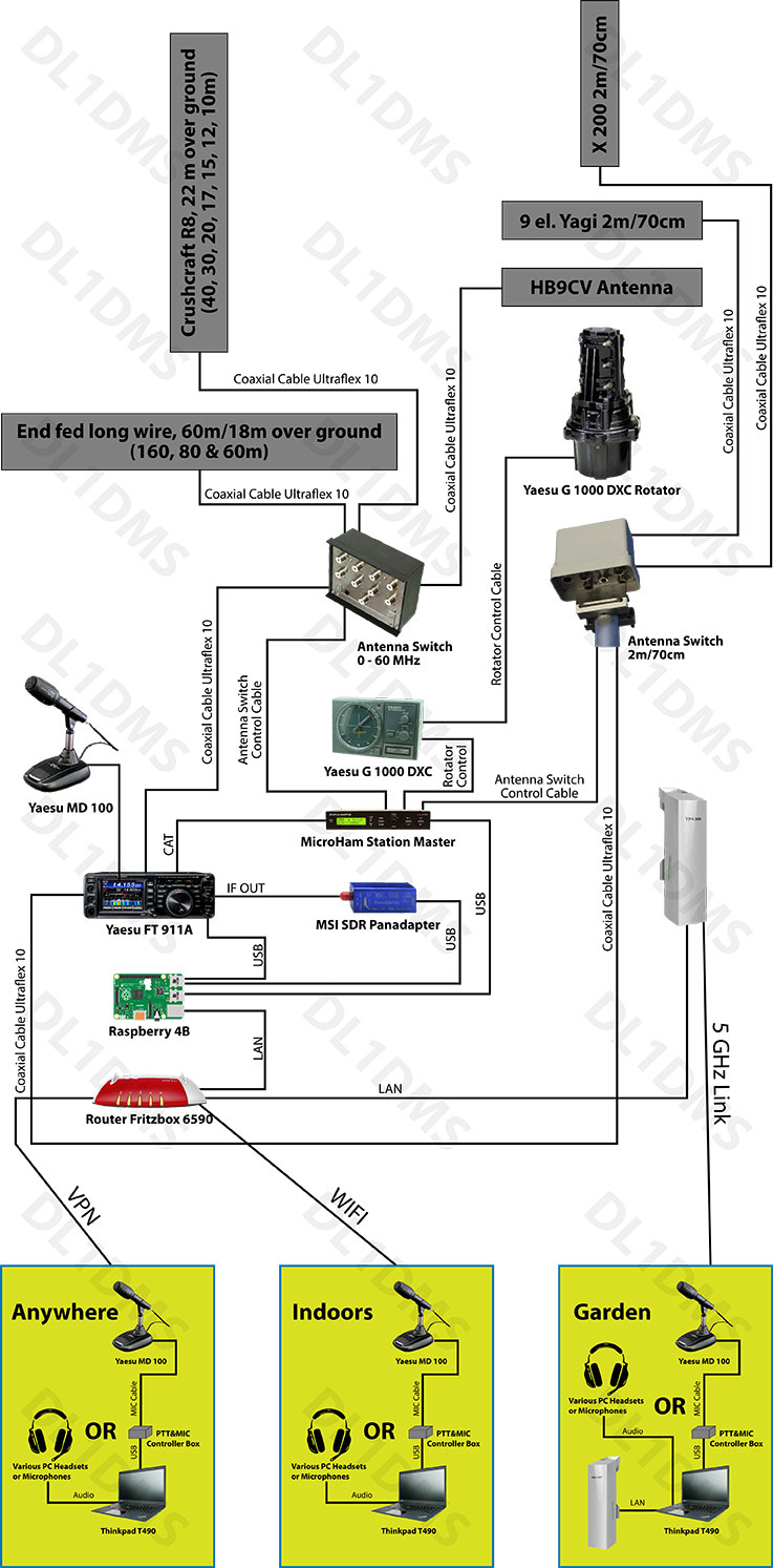 Auf dieser Seite finden Sie eine schematische Übersicht über meine Amateurfunkstation ohne dass RC-Forb (remotehams.com), RemoteTX oder ähnliche Software oder Server, welche "millionen von Kilometern" entfernt stehen, verwendet werden müssen. Alle Daten bleiben in meinen Händen.